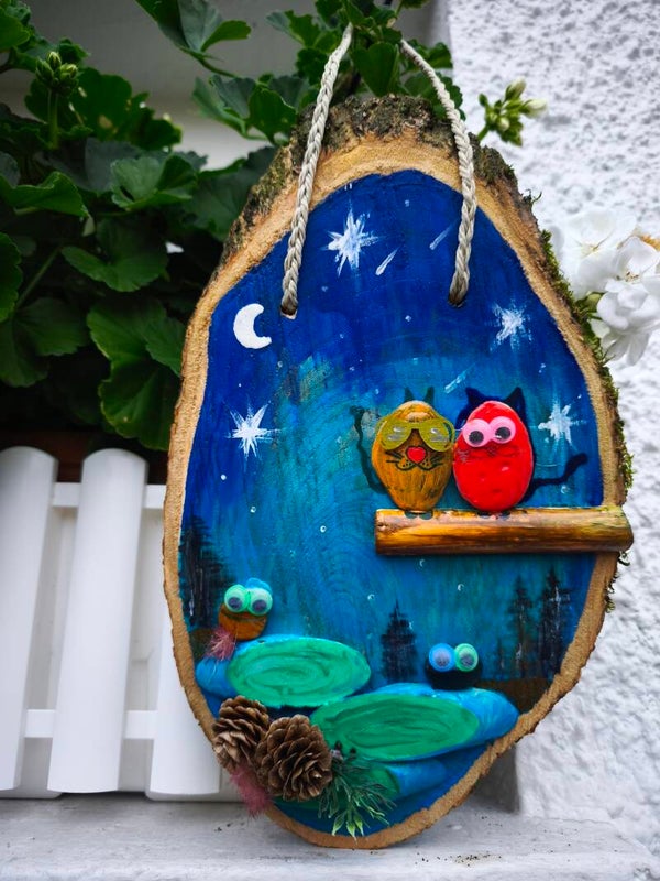 Naturholz selbst zugesägt, geschliffen und mit Acryl Farben bemalt.