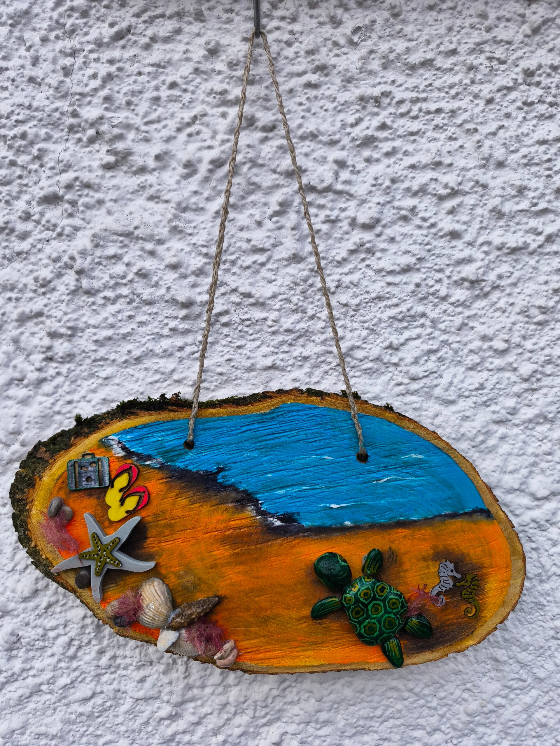 Naturholz selbst zugesägt, geschliffen und mit Acryl Farben bemalt.