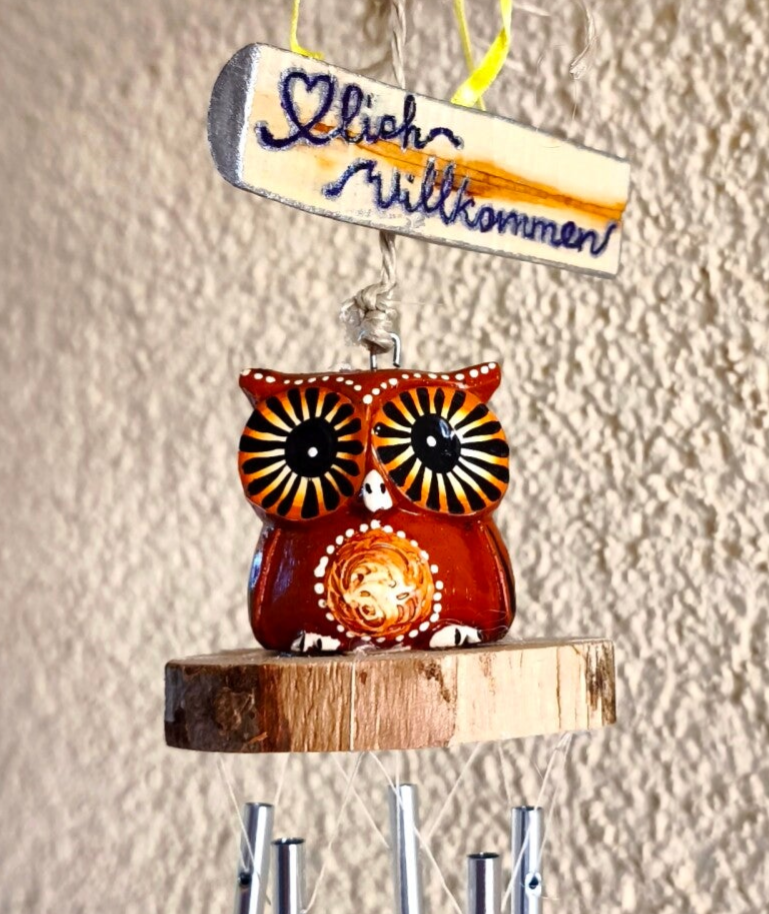 Windspiel Eule Braun, Dekorativer Gartenaufhänger, Deko Handgefertigt