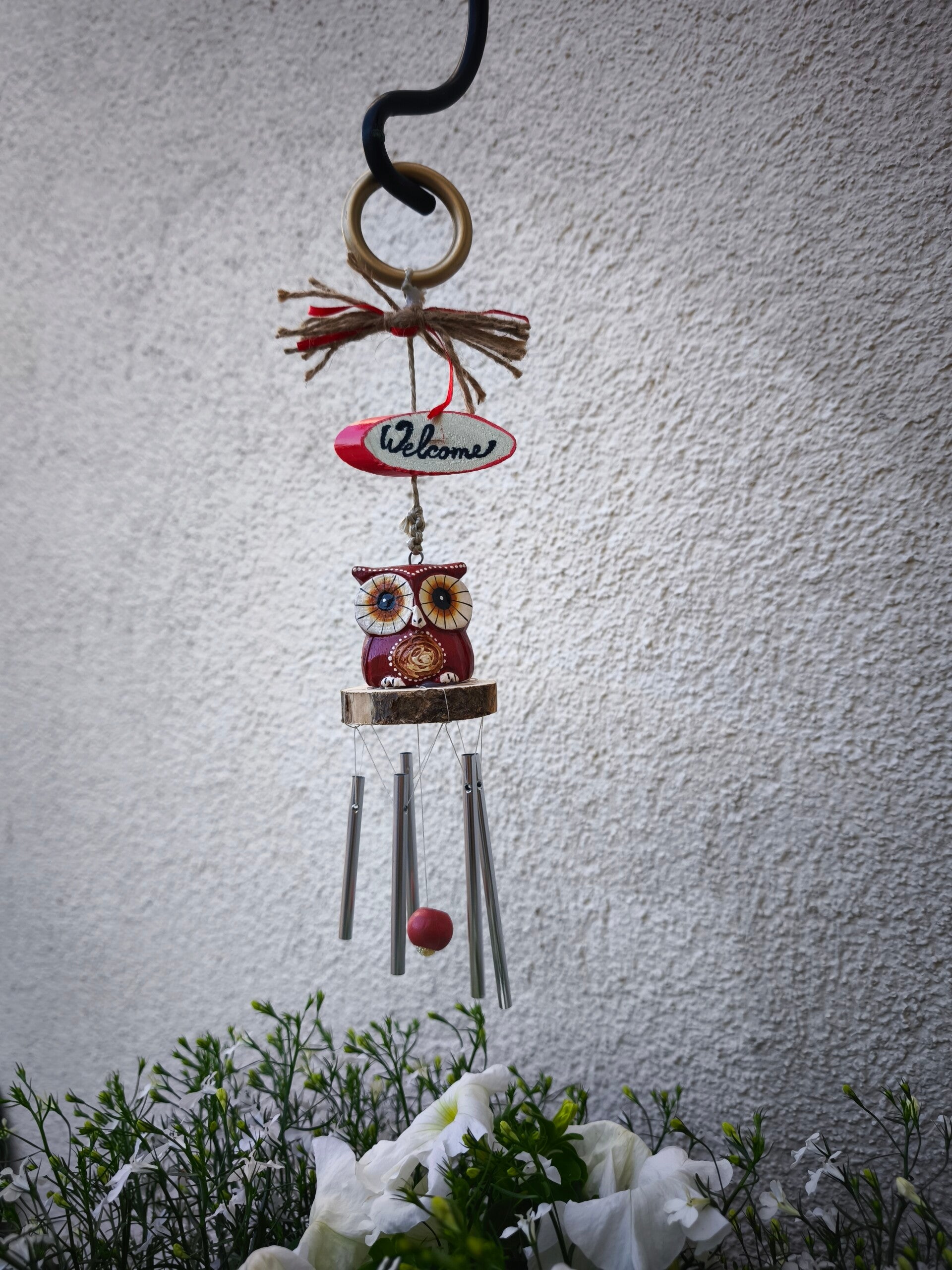 Windspiel Eule Rot, Dekorativer Gartenaufhänger, Deko Handgefertigt