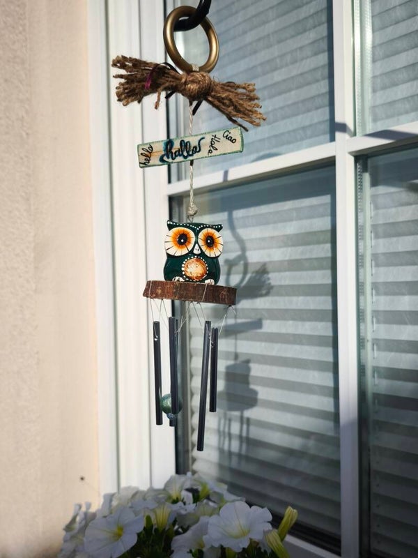 Windspiel Eule Grün, Dekorativer Gartenaufhänger, Deko Handgefertigt