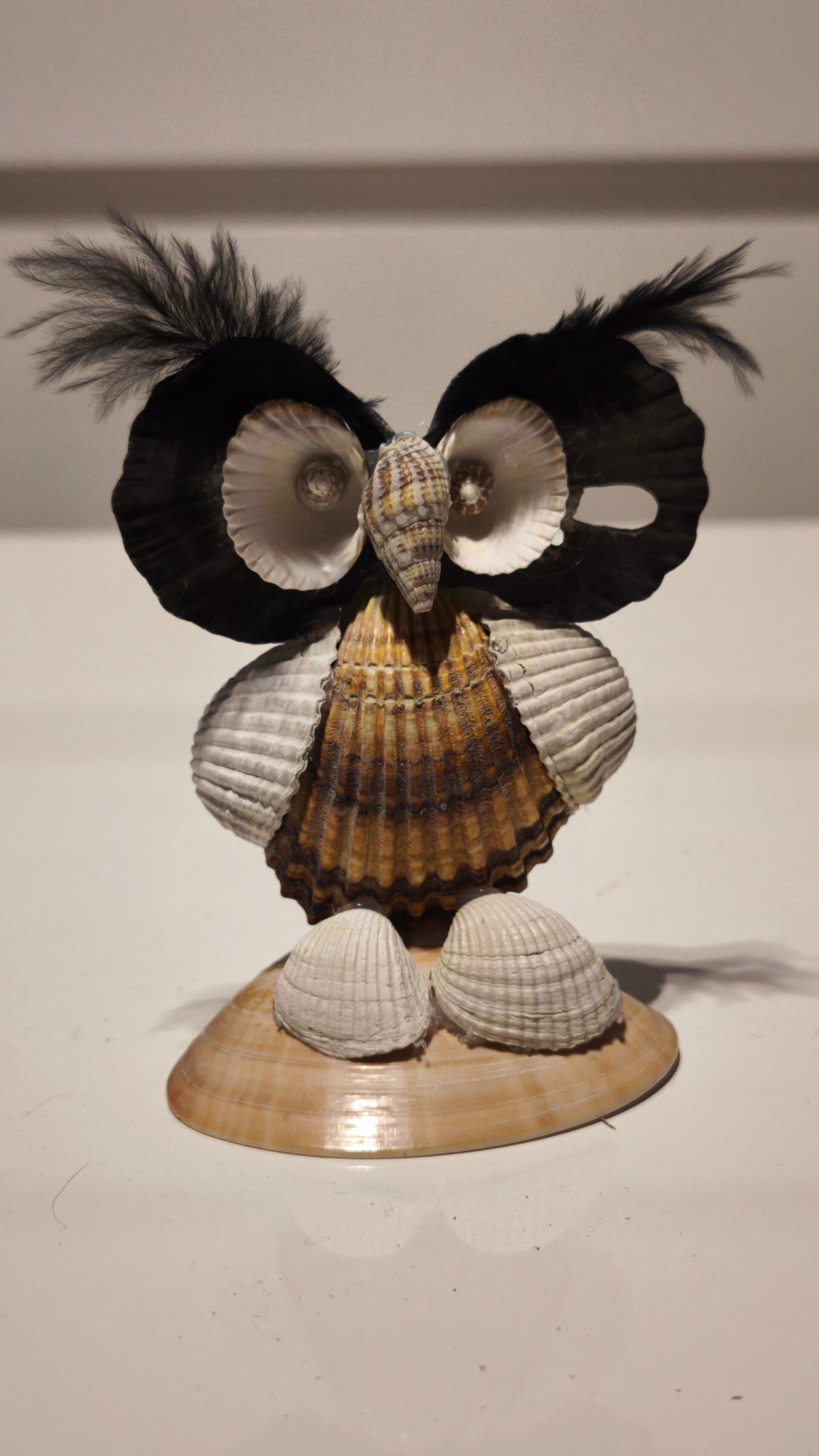 Vintage Muschel-Eule, Handgemacht aus Muscheln und Feder, Souvenir