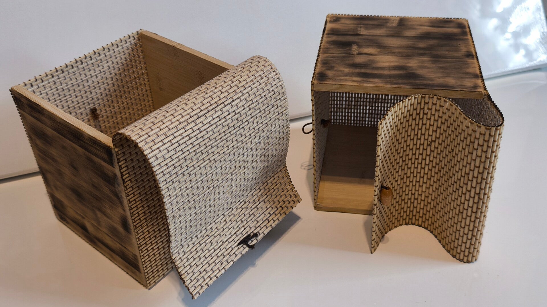 Schöne Holzboxen im geflochtenen Design mit praktischer Klappe und Knauf zum Öffnen. Ideal zur Aufbewahrung von Tee, Kaffee, Gewürzen oder kleinen Utensilien. Die Boxen sind stabil verarbeitet, haben eine natürliche Optik und bringen einen rustikalen, dekorativen Akzent in Küche oder Wohnbereich.