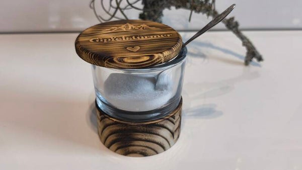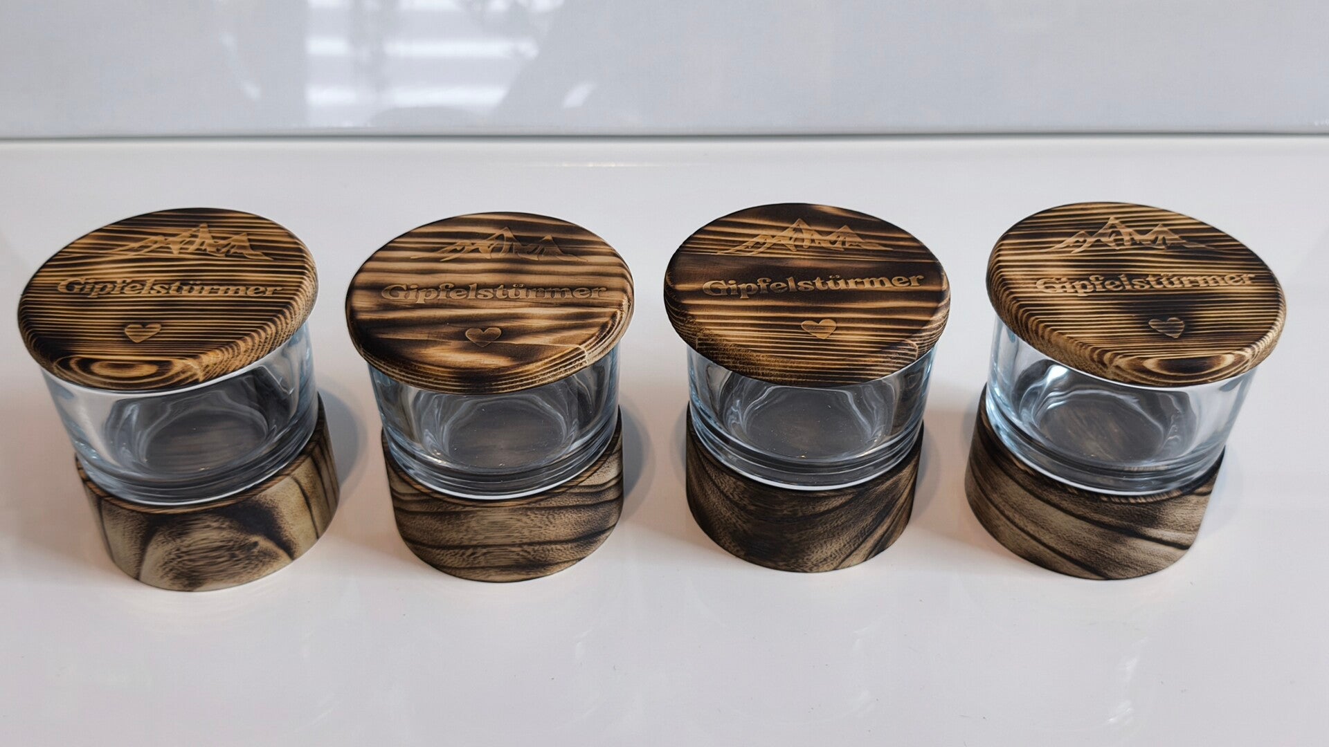 Dekorativer Glasbehälter mit Deckel und Untersetzer aus Holz, graviert mit „Gipfelstürmer“ und Bergmotiv. Perfekt zur Aufbewahrung von Keksen, Süßigkeiten oder kleinen Snacks. Praktisch und gleichzeitig ein schöner Hingucker in jeder Küche – auch ideal als Geschenk.