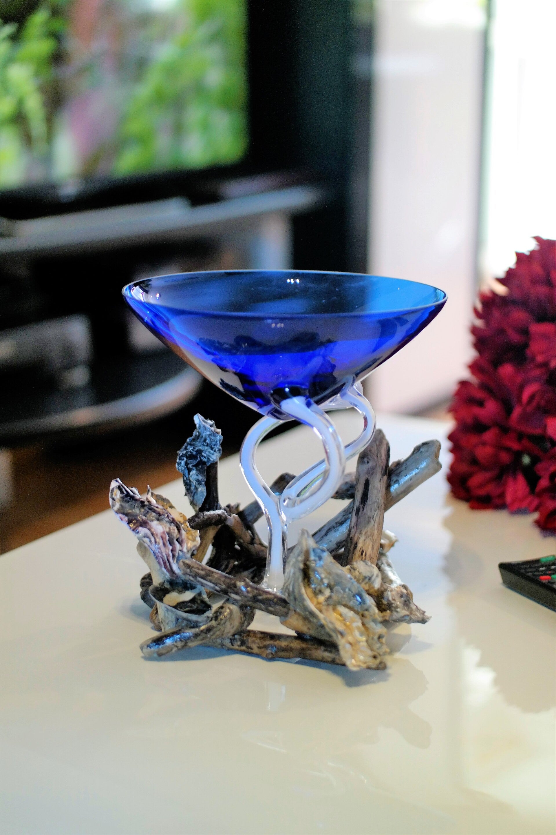Deko Vase Treibholz Kranz Fruchtschale mit Glasvase Blau 26 cm