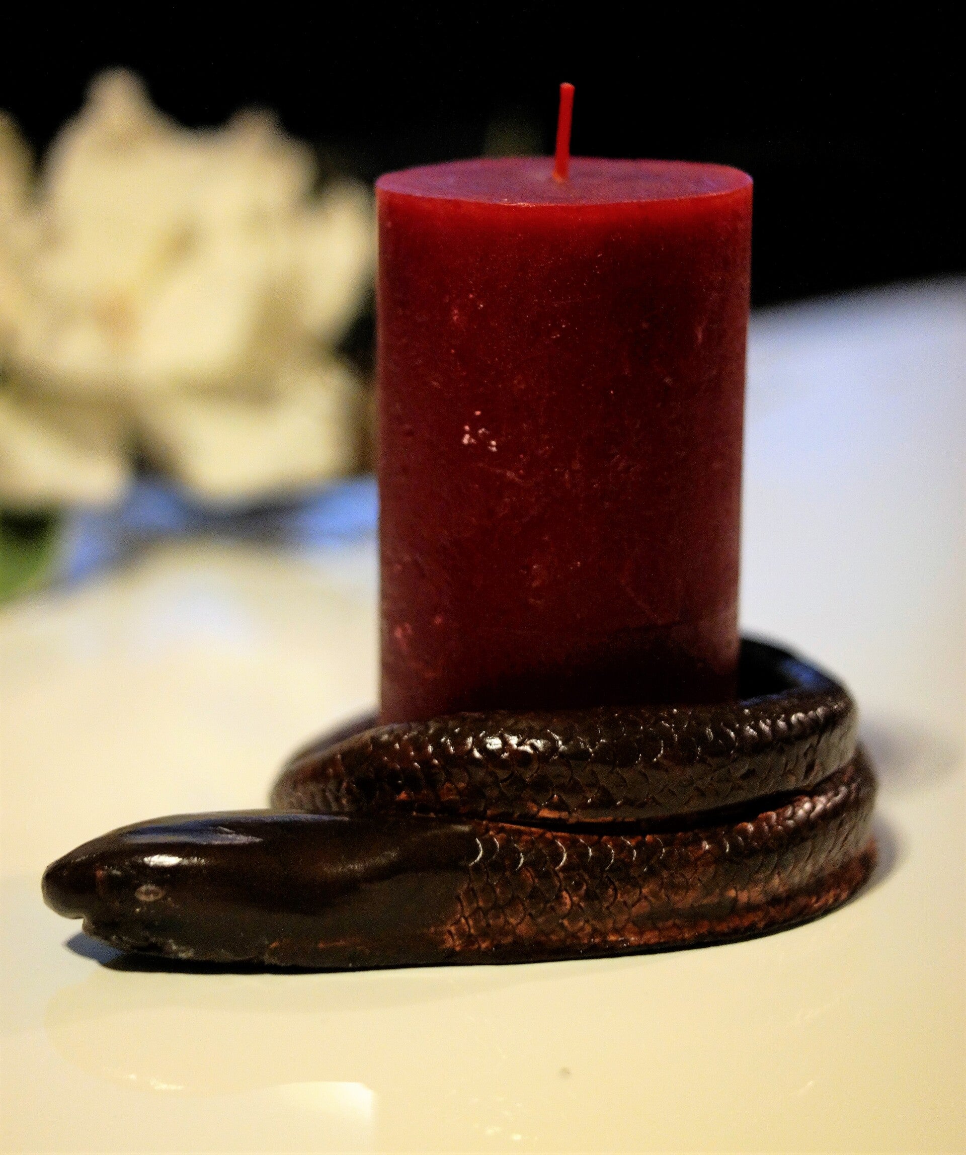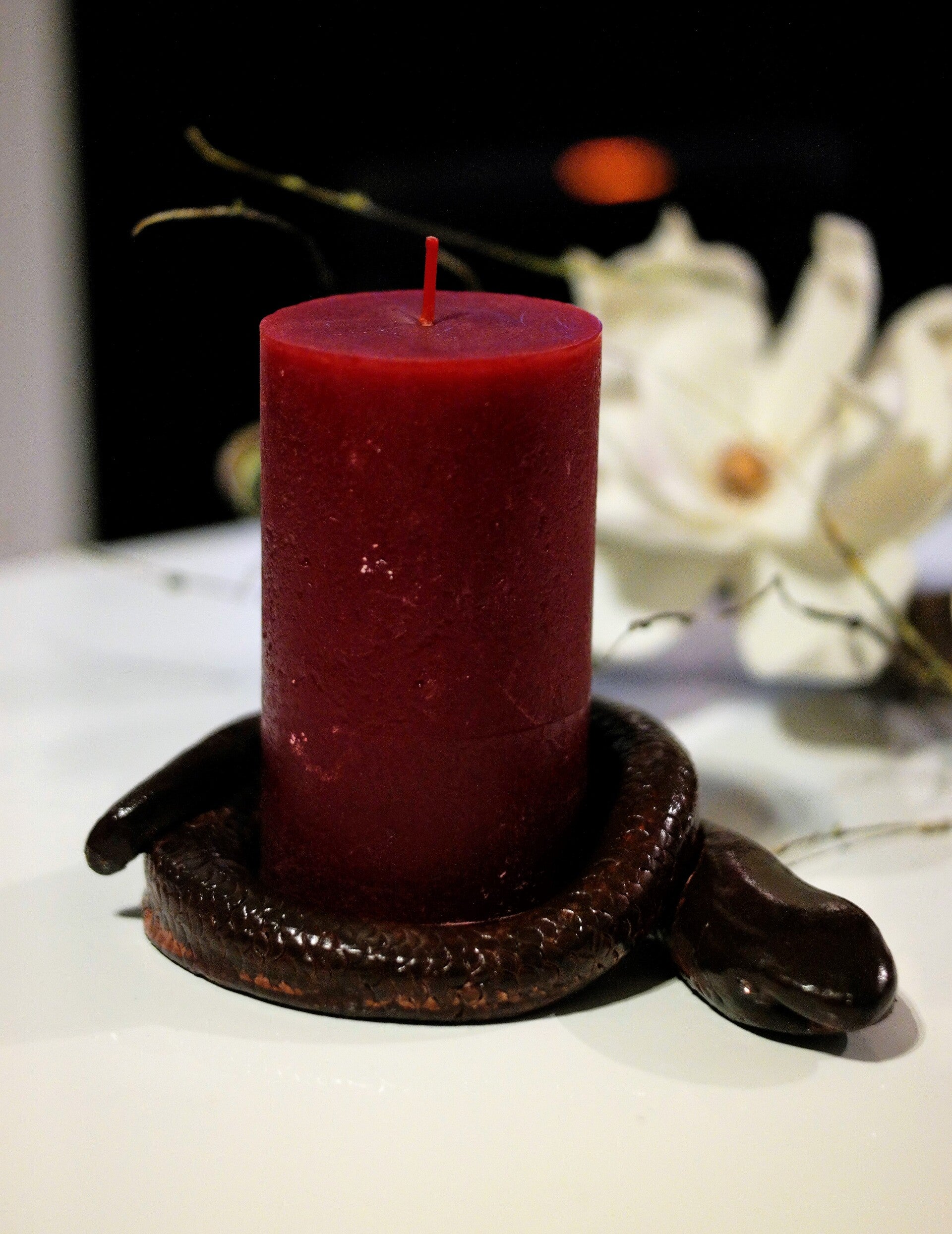 Tischdekoration / Kerzenständer / Kerzenhalter "Schlange Weinrot" mit integriertem Zirkonia Steinen als Augen, inkl. Kerze (Weinrot).